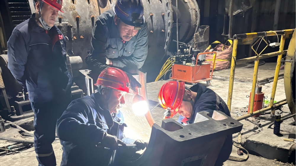 故障發(fā)生后,白玉銀興公司經(jīng)理田東清迅速抵達(dá)現(xiàn)場,根據(jù)設(shè)備故障狀況進(jìn)行現(xiàn)場研判并采取果斷措施進(jìn)行停機(jī)搶修。在搶修現(xiàn)場,黨員干部主動亮身份、扛重?fù)?dān),充分發(fā)揮先鋒模范作用,成為搶修隊(duì)伍中的“主心骨”。田東清帶領(lǐng)維修團(tuán)隊(duì)趴在設(shè)備旁仔細(xì)排查故障點(diǎn),在刮瓦環(huán)節(jié)精細(xì)操刀,憑借多年豐富經(jīng)驗(yàn)和專業(yè)技術(shù)儲備,勾畫出完美的弧線。為了加快搶修進(jìn)度,搶修人員放棄休息時間,輪班作戰(zhàn)、每天連續(xù)工作16小時,累了就趴在桌上短暫小憩,始終堅(jiān)守在搶修一線。食堂將飯菜、飲用水送到現(xiàn)場,確保搶修人員有充沛的體力。